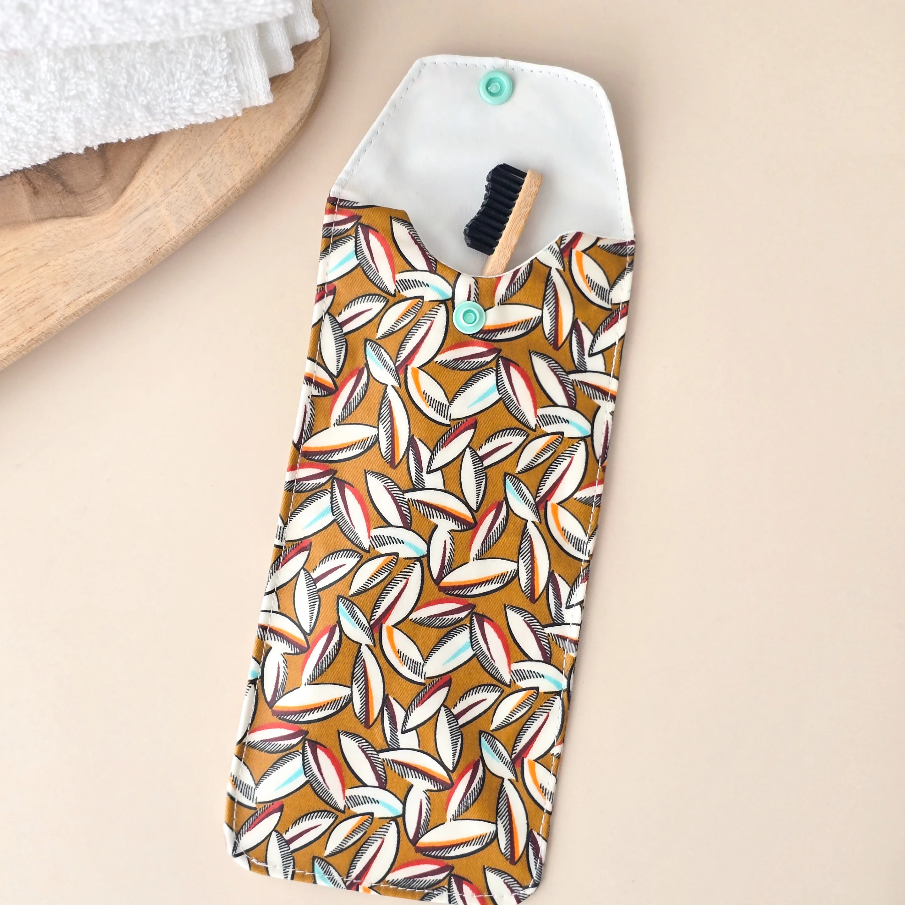 Glissez-la dans un etui brosse a dent coffee souple et imperméable dès qu'elle est sèche. La doublure PUL alimentaire crée une barrière propre entre les poils et le reste de votre trousse, sans piéger l'humidité comme le ferait une boîte plastique rigide.