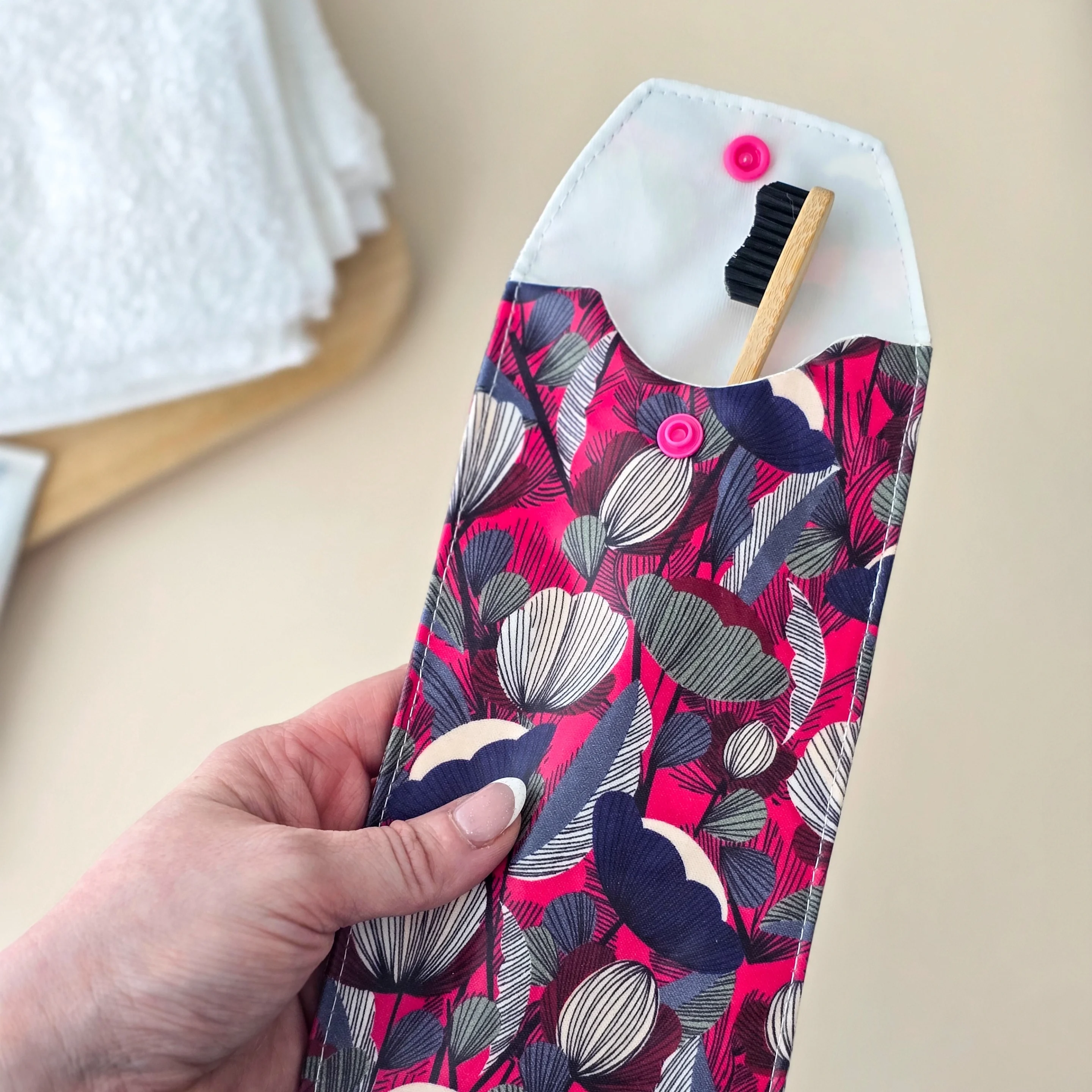 Glissez-la dans un etui brosse a dent pavot fushia souple et imperméable dès qu'elle est sèche. La doublure PUL alimentaire crée une barrière propre entre les poils et le reste de votre trousse, sans piéger l'humidité comme le ferait une boîte plastique rigide.
